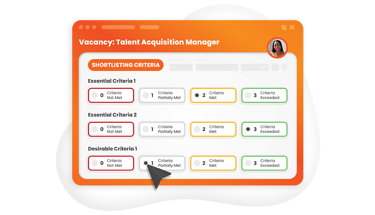 At the application review or interview stage, create forms that Hiring Managers or Recruiters must complete before the candidate progresses to the next stage or is rejected. Scorecards can contain calculated scores and automatically grade interviewee evaluations to set the application status or the interview outcome.