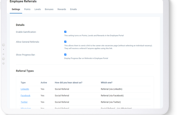 Enable gamification, the channels that can be used for referrals, and which employees are eligible