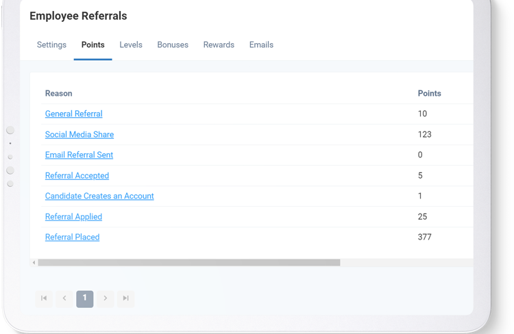 - Fully customisable points system for rewarding referral activity including: sharing vacancies, candidate registration, application, interviews and hire.