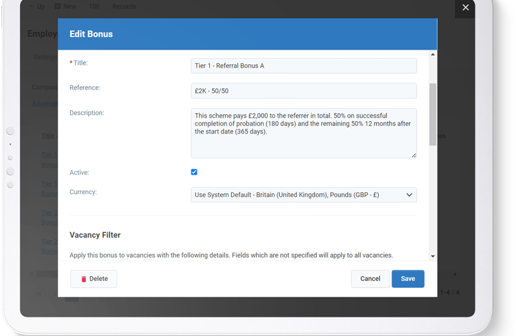 - Set different bonuses for vacancies based on any criteria (e.g. seniority, ‘hard-to-fill’)