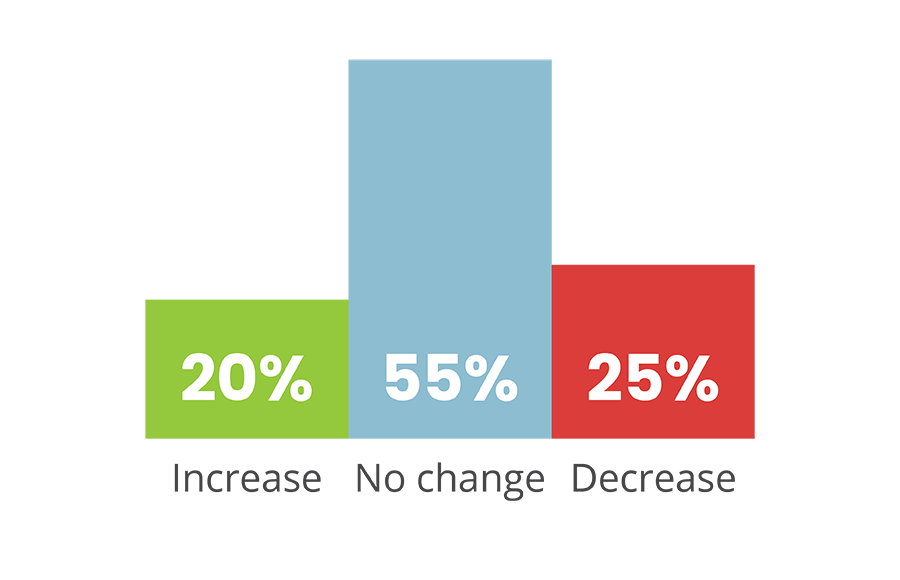 In the Education sector, the levels of hiring in the next 12 months are expected to stay the same, according to 55% of respondents, with only 20% expecting an increase. This year's report also showcases that no major changes in recruitment marketing budgets are expected, with 62% of respondents anticipating no change in budgets for recruitment marketing and 35% expecting to see a decrease in budgets, essentially having to deliver more with less.