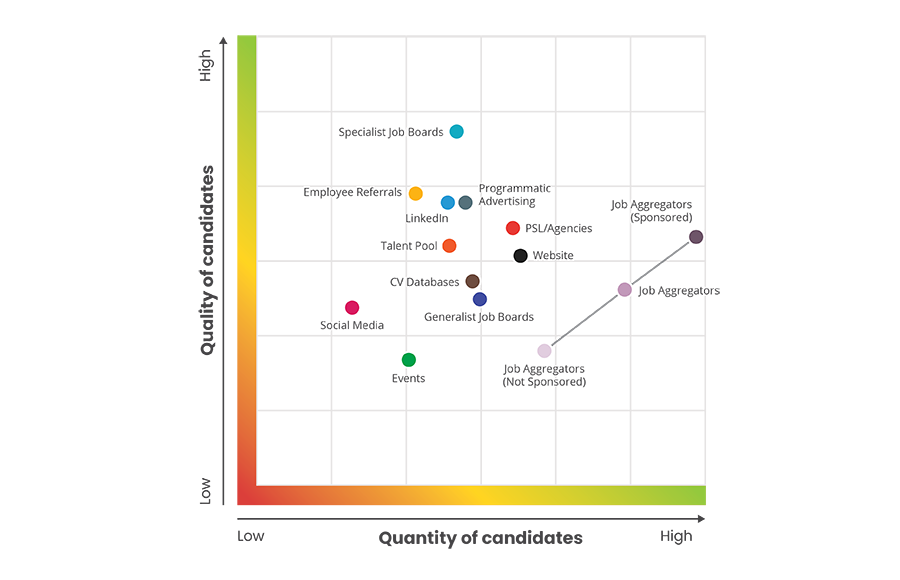 When we look at how recruiters in the Education sector are succeeding with talent attraction, the Sourcing Quadrant provides an overview of the top-performing sourcing channels. Specialised Job Boards and Employee Referrals perform the best when it comes to candidate quality. Meanwhile, the use of Career Websites offers a good balance between quality and quantity.