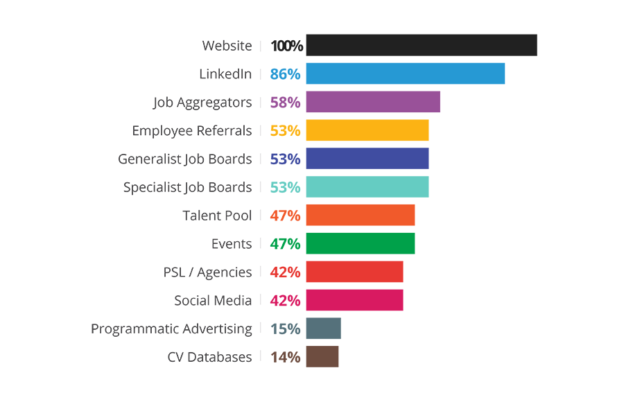The main sourcing channels used by the Education sector to attract candidates is Website/Careers Sites (the most-used channel 100%), followed by Professional Social Networks, such as LinkedIn (86%).